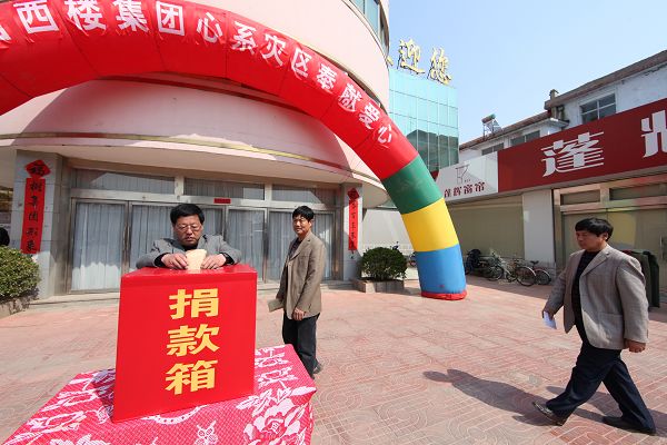 “携手同心,共渡难关”西楼人民心系玉树,为灾区献出一片爱心。4月24日下午2点,西楼集团.全体干部员工踊跃捐款支持抗震救灾工作,表达对灾区同胞的深切关爱。仅1个小时的时间,为青海地震灾区捐款73.2905万元,其中,集团公司捐款20万元,房地产集团有限公司捐款13万元,电缆集团有限公司捐款10万元,1238名员工捐款30.2905万元。 地震无情,人间有情,西楼集团干部员工以实际行动支持灾区群众,抗震救灾,重建家园。
